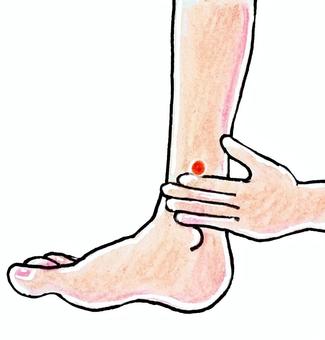 足の内くるぶし真ん中の高い所より指4本分上の部分。